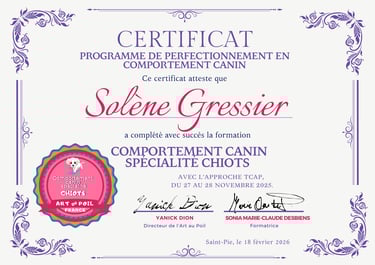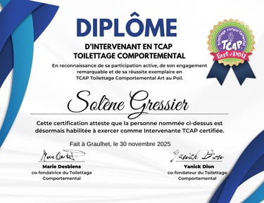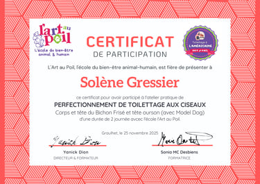 La formation et l’apprentissage continu sont au cœur de ma démarche : je cherche toujours à enrichir mes connaissances pour devenir une meilleure toiletteuse et offrir à chaque chien un soin adapté à ses besoins.